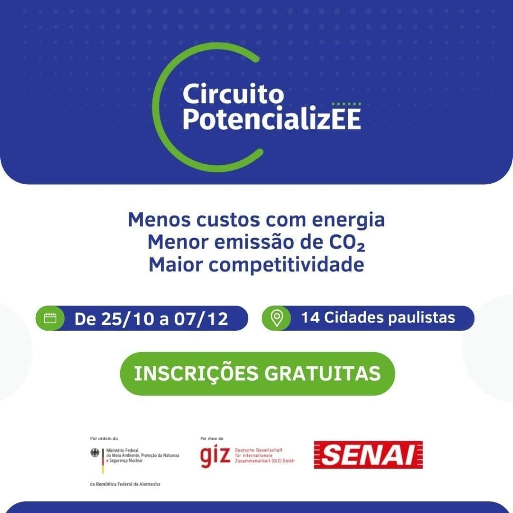 A Agência Alemã de Cooperação Internacional (GIZ) e o SENAI-SP vão realizar, entre 25 de outubro e 07 de dezembro, o Circuito PotencializEE, um roadshow com foco em eficiência energética e voltado para empresários e profissionais de pequenas e médias indústrias do estado de São Paulo. No total, serão realizados encontros em 14 municípios paulistas, nos quais serão apresentadas as iniciativas que estão gerando economia no custo da energia e redução na emissão de CO₂, e proporcionando acesso a linhas de financiamento para projetos de Eficiência Energética e ganhos de competitividade para pequenas e médias indústrias da região. A inscrição é gratuita e pode ser feita aqui.