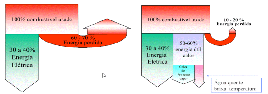 Figura 1: Eficiência de um ciclo térmico sem cogeração e eficiência de um ciclo térmico com cogeração (Fonte: INEE)