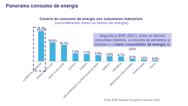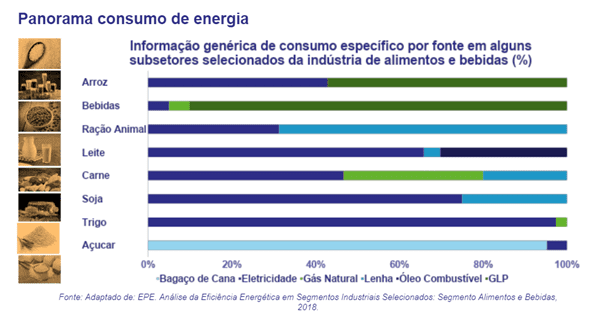 Quando se trata da produção de alimentos e bebidas e o quanto este processo consome de energia, o setor continua ocupando o topo da lista, com 22,1% do uso da energia disponível no país, perdendo somente para o setor metalúrgico. Embora utilize majoritariamente o bagaço de cana (74%) como fonte primária, a indústria também se apoia muito na eletricidade (10,30%) e lenha (9,70%), sendo esta última uma fonte não renovável e a primeira das menos recomendáveis de energia renovável.